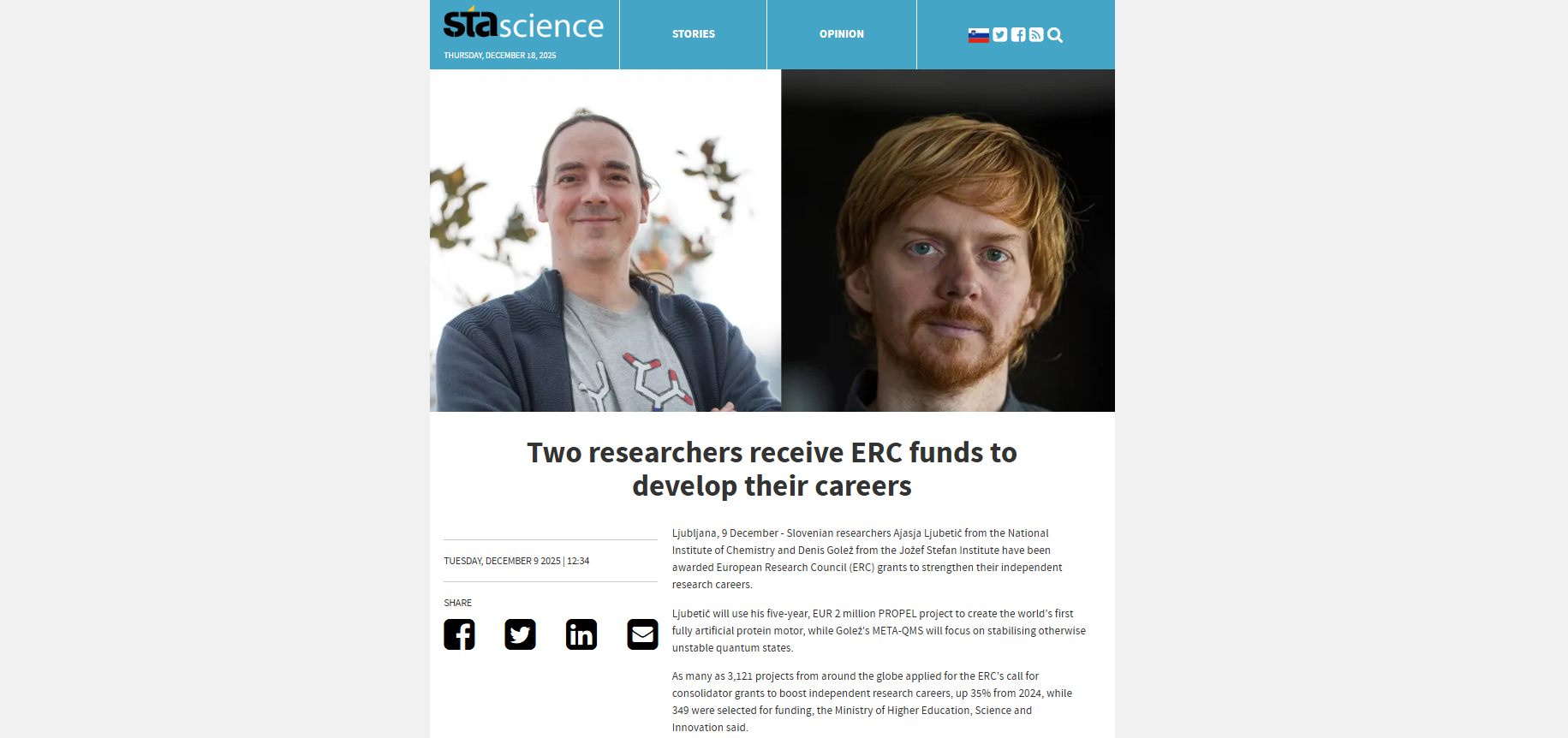 Researchers Dr Denis Golež of the Jožef Stefan Institute and Dr Ajasja Ljubetič of the National Institute of Chemistry have been awarded European Research Council ERC Consolidator Grants to strengthen their independent research careers. Within a five-year project, Dr Ljubetič will pursue the development of the first fully artificial protein motor, while Dr Golež will focus on the stabilisation of inherently unstable quantum states.